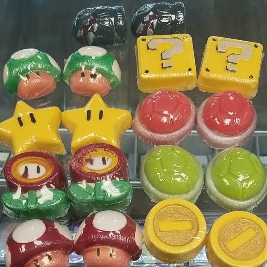 Coin, Red Shell, Green Shell, Q Block, Bullet Bill, 1-UP Shroom, Mushroom, Fire Flower, Star