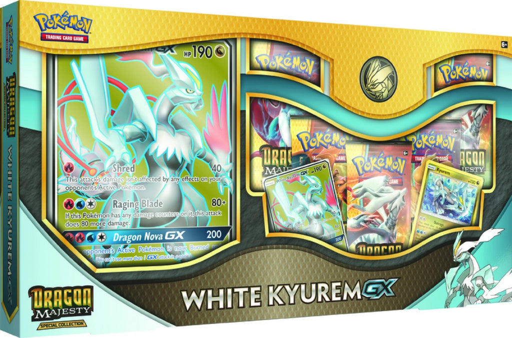 Each Pokemon TCG: Dragon Majesty Special Collection Salamence-GX/White Kyurem-GX set includes 2 boxes - one for each character. Each box includes a full-art promo card featuring Salamence-GX or White Kyurem-GX, a foil promo card featuring Salamence or Kyurem, a full-art oversize card featuring Salamence-GX or White Kyurem-GX, 5 Pokemon TCG: Dragon Majesty booster packs, a Salamence or White Kyurem coin, and a code card for the Pokemon Trading Card Game Online.