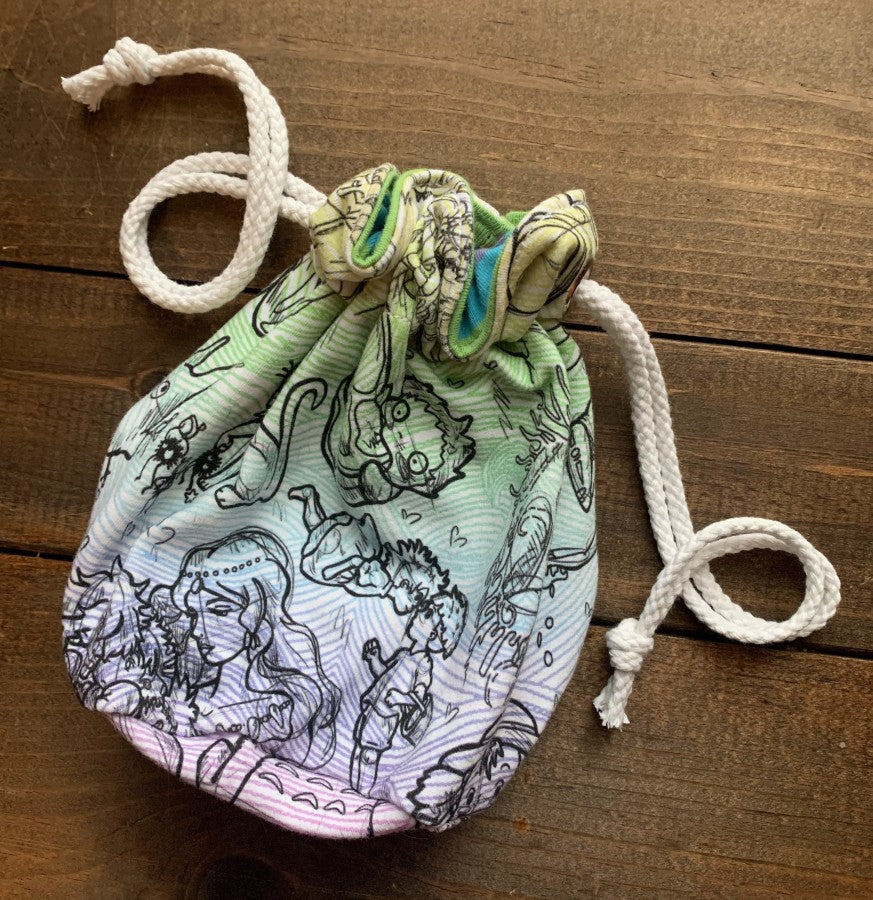 Handmade drawstring dice bag. This bag is about 7 inches tall, and 5 inches wide.