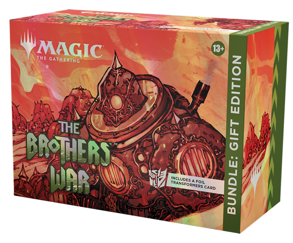 Celebrate *The Brothers' War* with a deluxe bundle full of exclusive accessories and cards that will transport fans back to beloved styles and storylines from 1990s *Magic*. On top of the usual Bundle goodies, the Gift Bundle contains a 15-card Collector Booster, including cards with special card treatments, 10–11 shining foil cards, and a total of 6 cards of rarity Rare or higher. The Gift Bundle also contains 1 Traditional Foil Transformers Mythic Rare card, 8 *The Brothers’ War* Set Boosters, 40 basic lands (20 traditional foils and 20 nonfoils), 1 traditional foil alternate-art promo card, 1 exclusive oversized Spindown life counter, 1 special Gift Edition foil card storage box, and 2 reference cards.