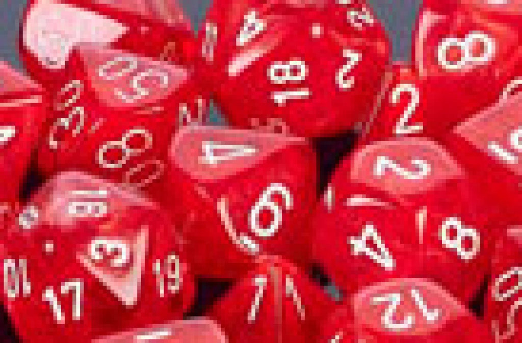 Vortex Red / White 7 Dice set, in its original plastic cube from Chessex. Comes with one D4, D6, D8, D10 0-10, D10 00-90, D12, D20. Picture shows the style of the dice.